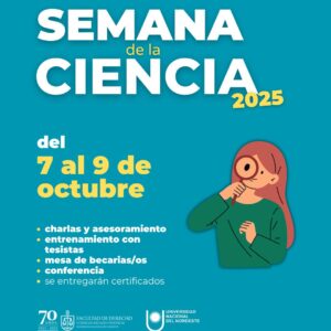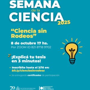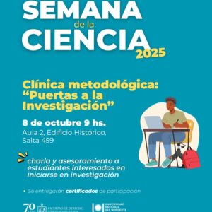 El miércoles 8 de octubre la agenda se desdobla: por la mañana, a las 9 hs. en el Aula 2 del Edificio Histórico (Salta 459), se dictará la Clínica metodológica: “Puertas a la Investigación”, orientada a estudiantes que deseen dar sus primeros pasos en el campo. Por la tarde, a las 17 hs. (vía Zoom – ID: 821 8718 9702), tendrá lugar el formato “Ciencia sin Rodeos”, donde los tesistas deberán exponer su trabajo en solo tres minutos.