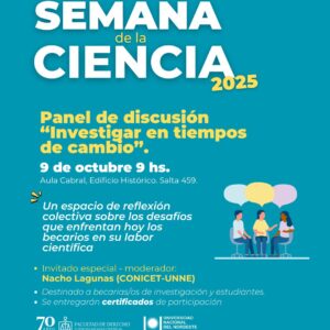 El cierre de la Semana Científica estará marcado por dos eventos centrales el jueves 9 de octubre. A las 9 hs., en el Aula Cabral del Edificio Histórico, se realizará el Panel de discusión: “Investigar en tiempos de cambio”, un espacio vital para debatir los desafíos y oportunidades de la ciencia en el contexto actual. El panel contará con la moderación del Dr. Ignacio Contreras (CONICET – UNNE).