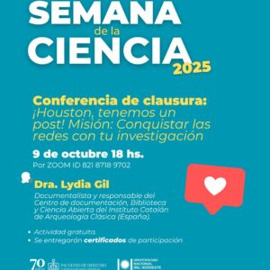 Finalmente, la Conferencia de Clausura abordará un tema de alta relevancia: la comunicación científica. Bajo el título “¡Houston, tenemos un post! Misión: Conquistar las redes con tu investigación”, la Dra. Lydia Gil (Instituto Catalán de Arqueología Clásica – España) dictará la charla de cierre a las 18:00 hs. por Zoom (ID: 821 8718 9702), ofreciendo herramientas para llevar la investigación a las plataformas digitales.