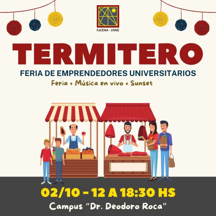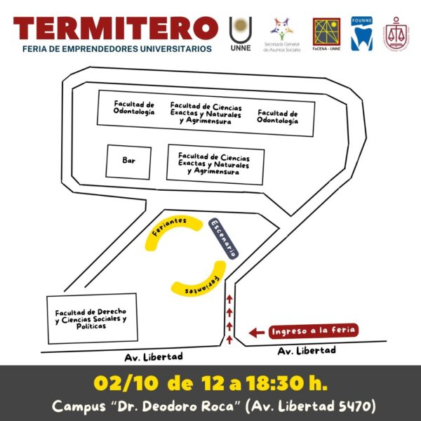 Desde la presidencia del Campus Deodoro Roca de la Universidad Nacional del Nordeste a cargo de la Facultad de Ciencias Exactas y Naturales y Agrimensura se invita a participar de la segunda edición de Termitero, la feria que convoca a los emprendedores y emprendedoras universitarias de la zona, en una jornada plena de actividades a desarrollarse en el predio frente al edificio de Química en el Campus Roca de la UNNE, ubicado Avenida Libertad y calle UNNE, Corrientes.