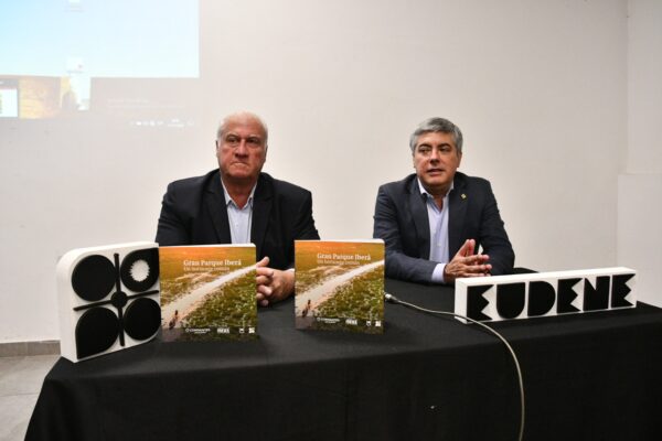 El rector Larroza y el senador Flinta en la presentación del libro Gran Parque Iberá en 2024