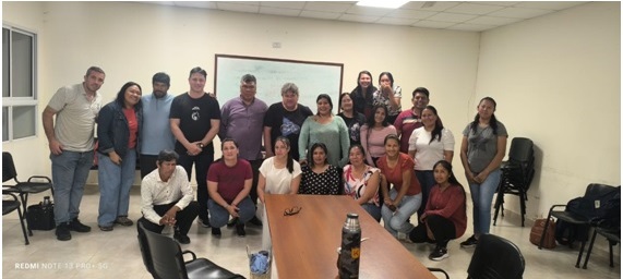 Por otra parte, en Fortín Lavalle se desarrolló un encuentro con docentes de idioma qom, estudiantes y la comunidad local. Las actividades estuvieron orientadas a la valoración y preservación del idioma originario, la cosmovisión de los pueblos originarios y la relevancia de su identidad cultural en la construcción de la región. Se trabajó en torno a la importancia de la imagen como vehículo de expresión cultural y de memoria colectiva, destacando cómo la representación gráfica y la xilografía pueden transmitir saberes, historias y símbolos de las comunidades originarias, promoviendo la resignificación y difusión de sus tradiciones.