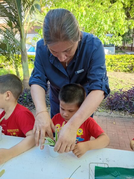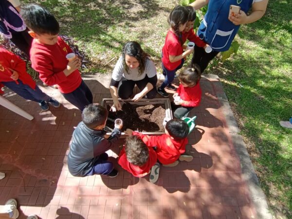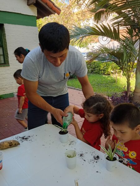Los niños y niñas de las salas de 3 y 4 años realizaron trasplante de ornamentales en macetas recicladas que trajeron junto con las docentes. Así, llenaron sus pequeñas macetas con sustrato, para luego realizar la colocación de la planta y posterior riego.