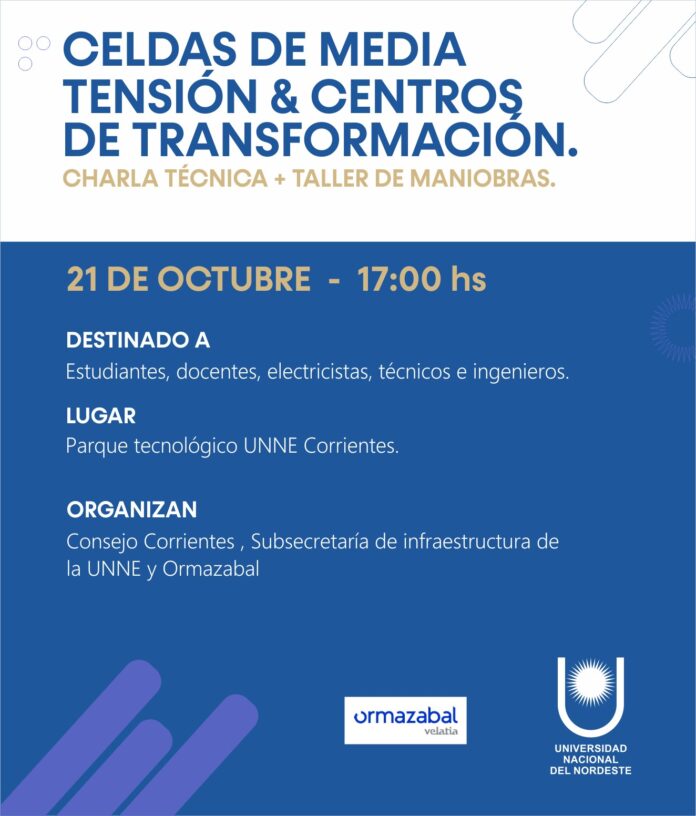 Este martes 21 de octubre a las 17 horas se realizará una charla técnica sobre Celdas de Media Tensión y Centros de Transformación en el Parque Tecnológico UNNE ubicado en el Campus Deodoro Roca de la Universidad Nacional del Nordeste, en Corrientes. También se desarrollará un Taller de Maniobras. El encuentro está organizado por el Consejo Profesional de Ingeniería, Arquitectura y Agrimensura de Corrientes, la Subsecretaría de Infraestructura de la universidad y la empresa Ormazabal.