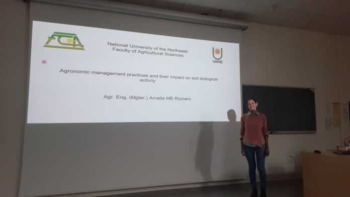 La ingeniera Romero presentó su investigación en inglés sobre la producción de compost y su aplicación en cultivos hortícolas. El trabajo pertenece a la Cátedra de Microbiología Agrícola de la UNNE. La charla se tituló «Prácticas de manejo agronómico y su impacto en la actividad biológica del suelo».