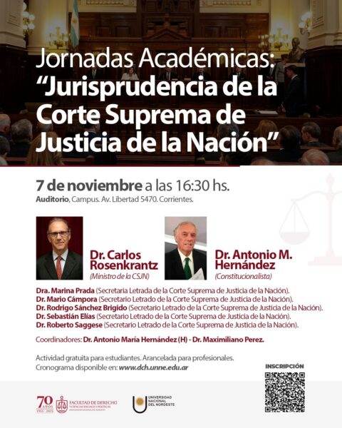 Corrientes se convertirá en el centro del debate jurídico nacional. La Facultad de Derecho y Ciencias Sociales y Políticas de la UNNE realizará las Jornadas Académicas “Jurisprudencia de la Corte Suprema de Justicia de la Nación”, un encuentro que reunirá al Dr. Carlos Rosenkrantz (Ministro de la CSJN) y al Dr. Antonio M. Hernández (máximo referente del federalismo).