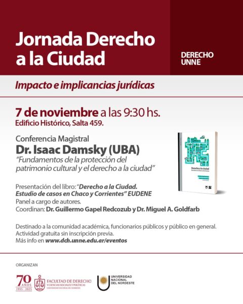 El próximo jueves 7 de noviembre a las 9:30 hs, la Facultad de Derecho y Ciencias Sociales y Políticas de la Universidad Nacional del Nordeste será sede de un evento académico de gran relevancia: la presentación del libro Derecho a la Ciudad, una obra colectiva que surge fruto de una investigación académica. La actividad se desarrollará en el edificio histórico de la facultad, ubicado en calle Salta Nº459, en la ciudad de Corrientes.