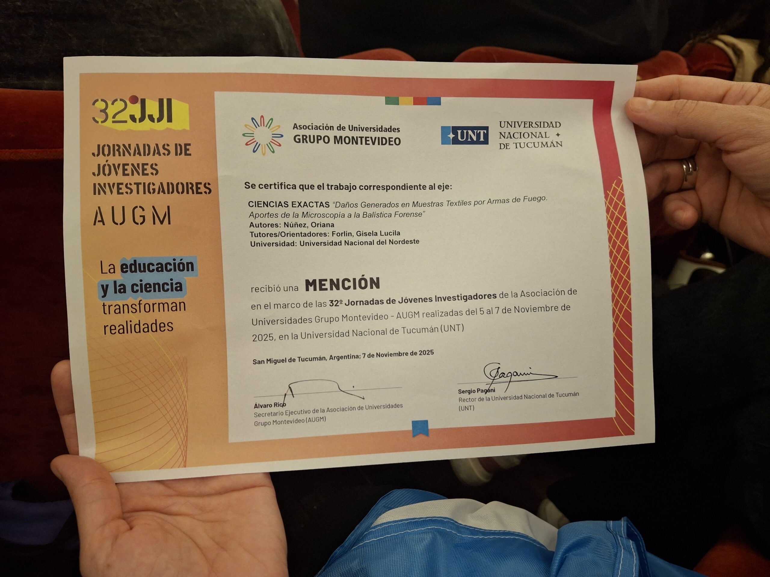 Una de las presentaciones premiadas correspondió a la Licenciada en Criminalística de la UNNE, Oriana Núñez, por su trabajo «Daños generados en muestras textiles por armas de fuego. Aportes de la microscopía a la balística forense», en el eje «Ciencias Exactas».