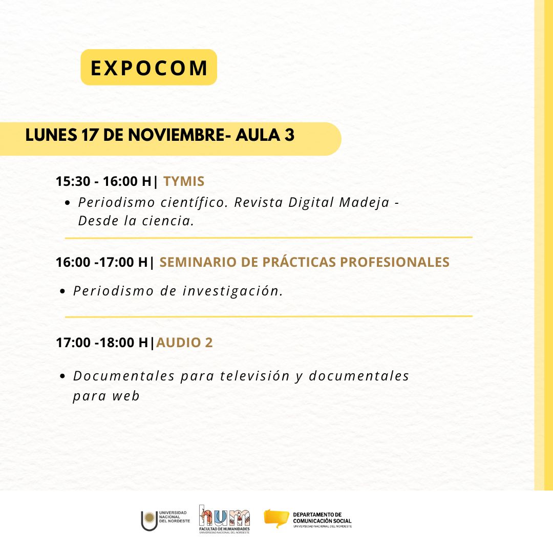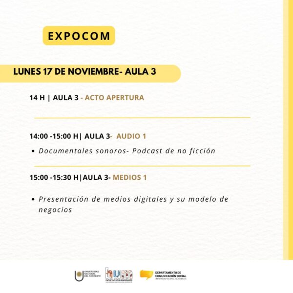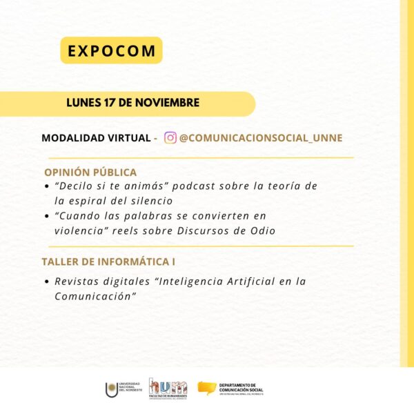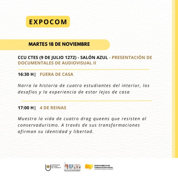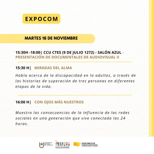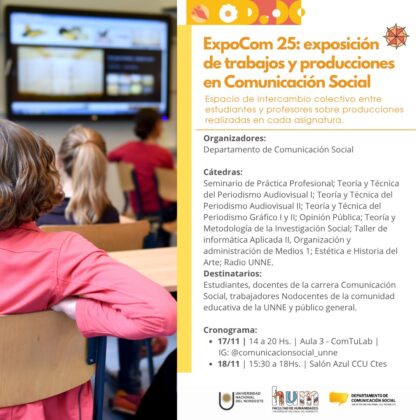 La propuesta de este tercer año de ExpoCom, realizada por docentes y estudiantes del Departamento de Comunicación Social, tiene como propósito generar un espacio de intercambio y cierre de las producciones realizadas en las aulas; pero abiertas siempre a la comunidad en la que está inserta la UNNE. Los temas, los problemas y los cambios sociales que se atraviesan comunitariamente se cuelan en estas producciones de los futuros profesionales de la comunicación.