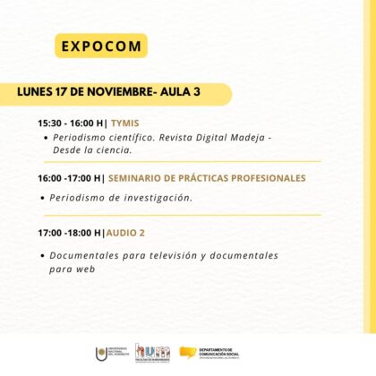 De 15.30 a 16, alumnos de cuarto año que cursan Teoría y Método de la Investigación Social presentarán la Revista Digital Madeja – Desde la ciencia. Una experiencia colectiva en el aula, un medio de comunicación sobre periodismo científico.