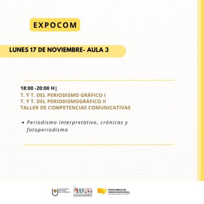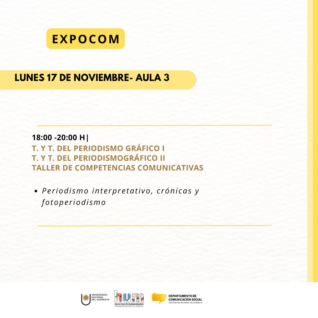 De 18 a 20, las cátedras Teoría y Técnica del Periodismo Gráfico I y II van a presentar producciones de periodismo interpretativo, crónicas y fotoperiodismo, investigaciones periodísticas elaboradas durante el cursado, en modalidad impresa y digital.