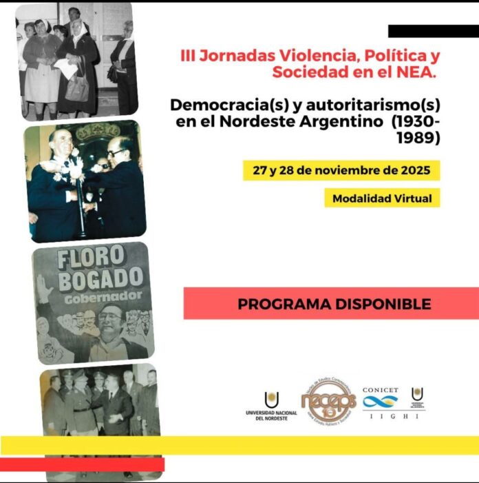 Este jueves 27 y el viernes 28 de noviembre se realizan las III Jornadas “Violencia, Política y Sociedad en el NEA. La región entre las democracia(s) y los autoritarismo(s) (1930–1989)”, organizadas por el Núcleo de Estudios Contemporáneos sobre estado, Política y Sociedad (Neceps), del Instituto de Investigaciones Geohistóricas (IIGHI) de la UNNE y CONICET.