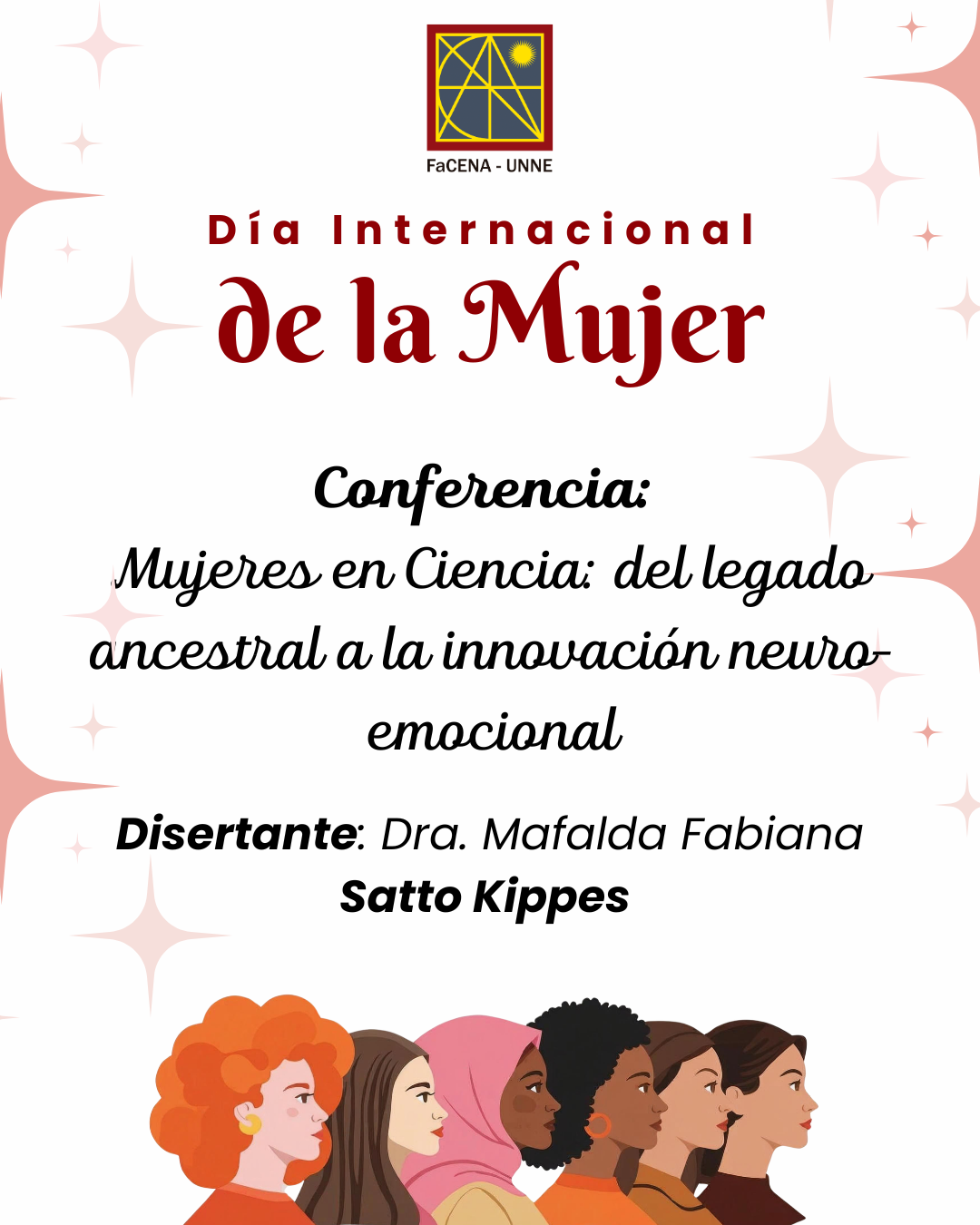 Por el Día Internacional de la Mujer que se conmemora este domingo 8 de marzo, el lunes 9 a las 11 horas, se desarrollará la 𝐶𝑜𝑛𝑓𝑒𝑟𝑒𝑛𝑐𝑖𝑎 𝑀𝑢𝑗𝑒𝑟𝑒𝑠 𝑒𝑛 𝐶𝑖𝑒𝑛𝑐𝑖𝑎: 𝐷𝑒𝑙 𝑙𝑒𝑔𝑎𝑑𝑜 𝑎𝑛𝑐𝑒𝑠𝑡𝑟𝑎𝑙 𝑎 𝑙𝑎 𝑖𝑛𝑛𝑜𝑣𝑎𝑐𝑖𝑜𝑛 𝑛𝑒𝑢𝑟𝑜-𝑒𝑚𝑜𝑐𝑖𝑜𝑛𝑎𝑙 a cargo de la doctora Mafalda Fabiana Satto Kippes. Será en el Aula de Posgrado de la Facultad de Ciencias Exactas y Naturales y Agrimensura, en el Campus Deodoro Roca de la UNNE.