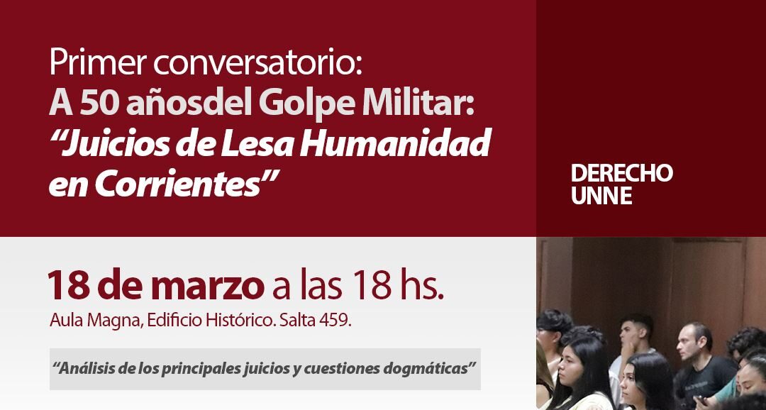 En el marco de la conmemoración por el 50° aniversario del último golpe de Estado en Argentina, la Facultad de Derecho y Ciencias Sociales y Políticas de la Universidad Nacional del Nordeste (UNNE) llevará a cabo el primer conversatorio: «Juicios de Lesa Humanidad en Corrientes».