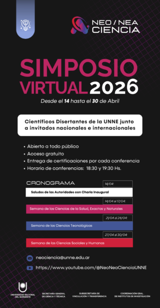 Desde este martes 14 y hasta el 30 de abril se realizará el Simposio Virtual «NEO/NEA Ciencia» edición 2026, que busca visibilizar la producción del conocimiento científico y tecnológico de la UNNE y de otras instituciones de ciencia del país y el extranjero. Se contará con más de veinte expositores, y una amplia variedad de temáticas de relevancia actual.