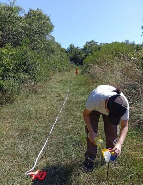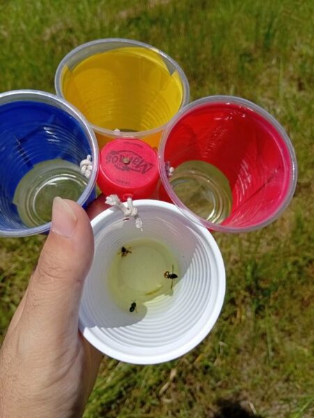 En cada uno de esos ambientes se trazarán dos recorridos de cien metros, separados entre sí por unos seiscientos metros de distancia. A lo largo de cada recorrido se colocarán cinco trampas para capturar insectos, una cada veinticinco metros. Cada trampa consiste en cuatro vasos de plástico de colores distintos —blanco, amarillo, rojo y azul— dispuestos juntos para imitar la apariencia de una flor con múltiples colores, de modo que el insecto reciba un estímulo visual similar al que recibiría frente a una flor real.